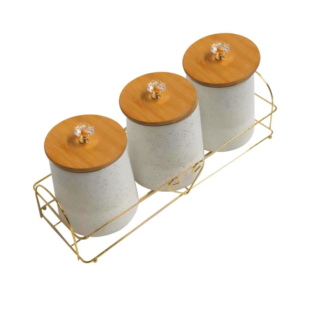 طقم حاويات سيراميك بطباعة تجريدية مكون من 3 قطع مع غطاء خشبي وحامل سعة 650 مل