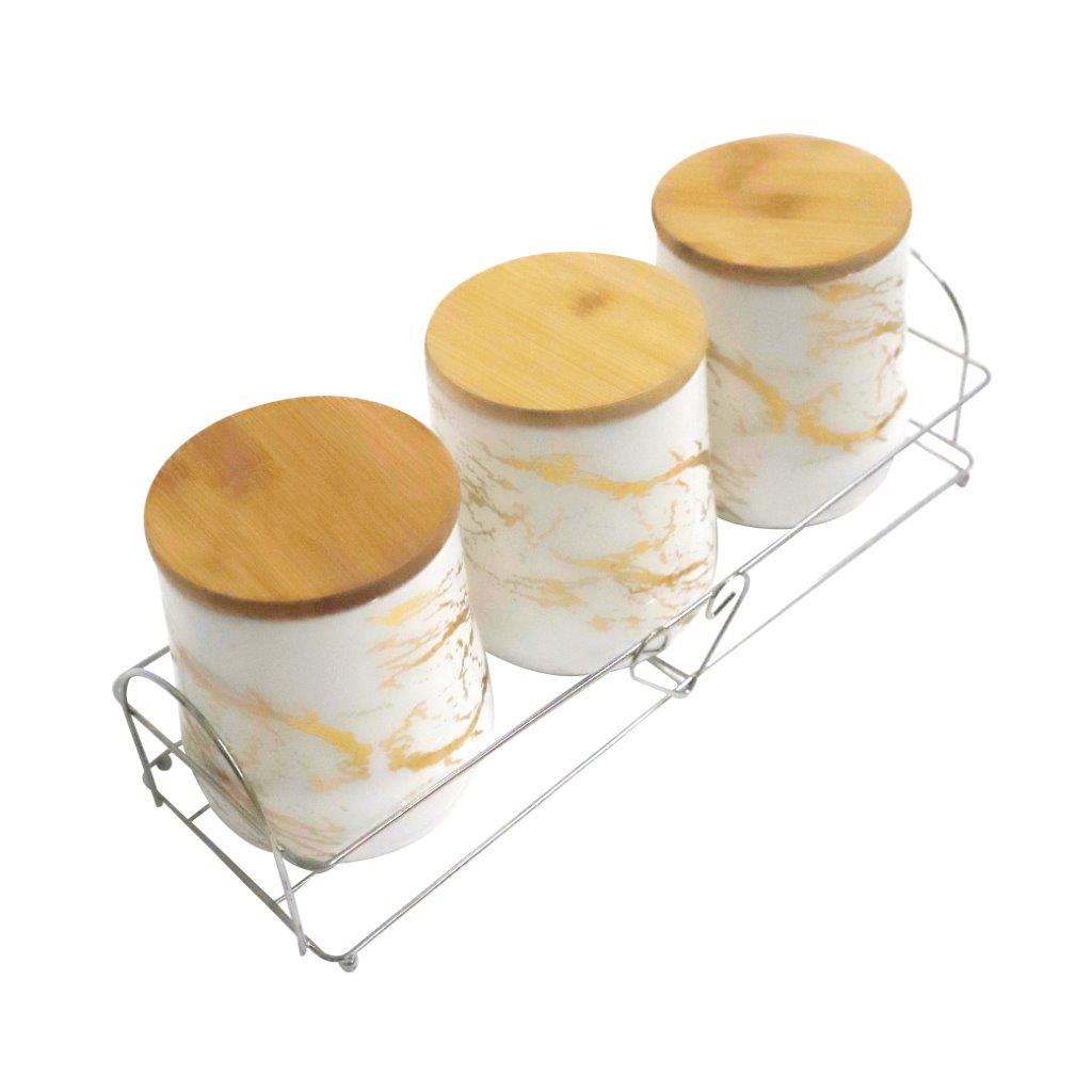 طقم حاويات سيراميك بطباعة تجريدية مكون من 3 قطع مع غطاء خشبي وحامل سعة 650 مل/180 مل
