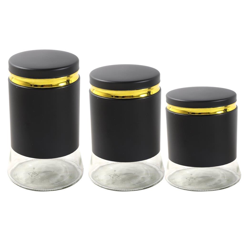 طقم حاويات زجاجية أساسية مختلطة باللون الأسود والذهبي للشاي والسكر والقهوة مكون من 3 قطع 11*8/8*15/20*8 سم