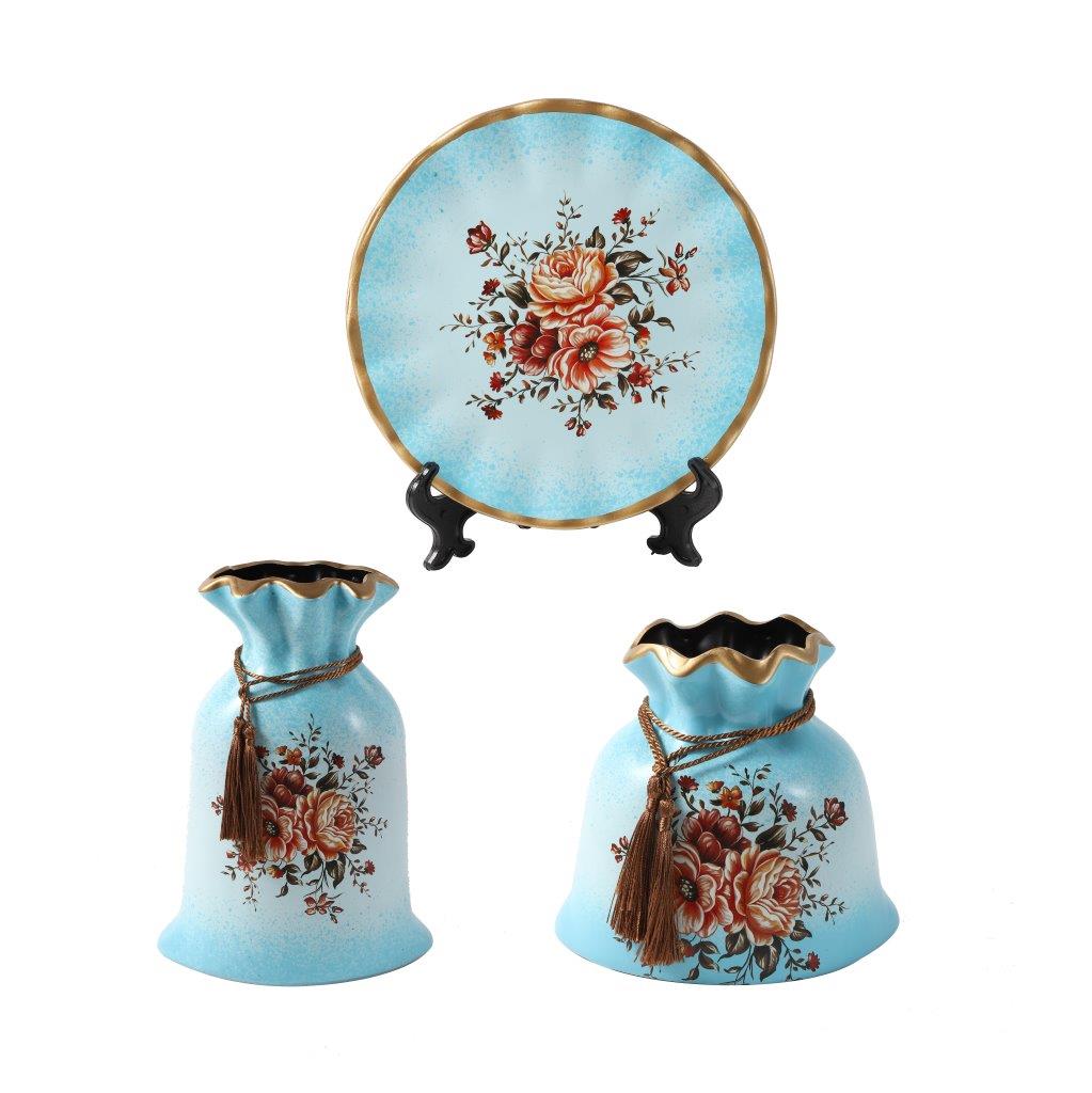 طقم مزهرية سيراميك للطاولة للديكور المنزلي مكون من 3 قطع بتصميم زهور فيروزي