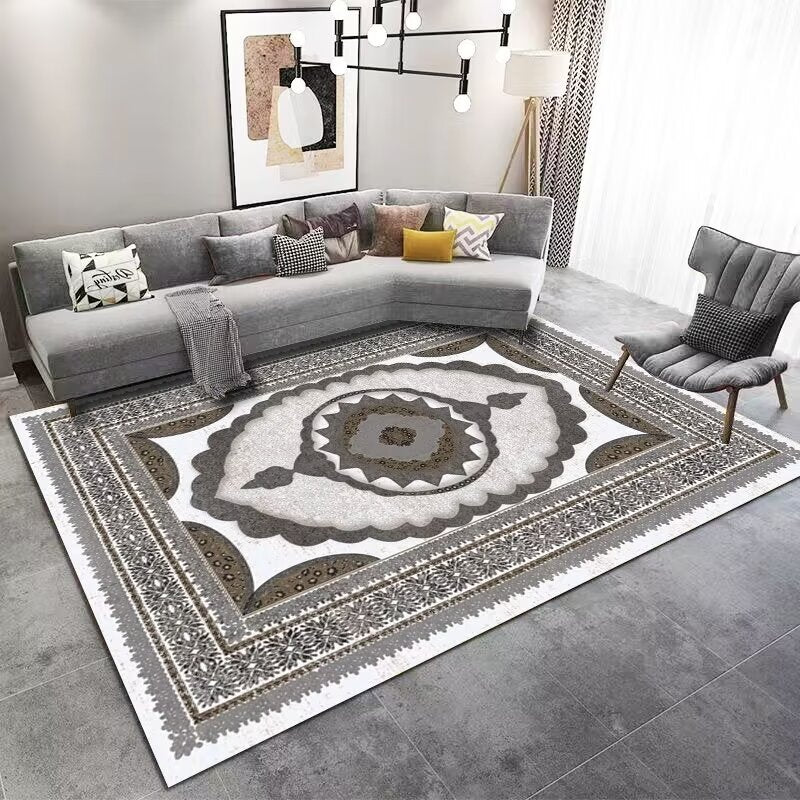 سجادة ميلانيز مودرن آرت ميدياليون ديزاين منسوجة آليًا للداخل باللون البيج والرمادي مع حافة بتصميم مطبوع ملكي 200*300 سم