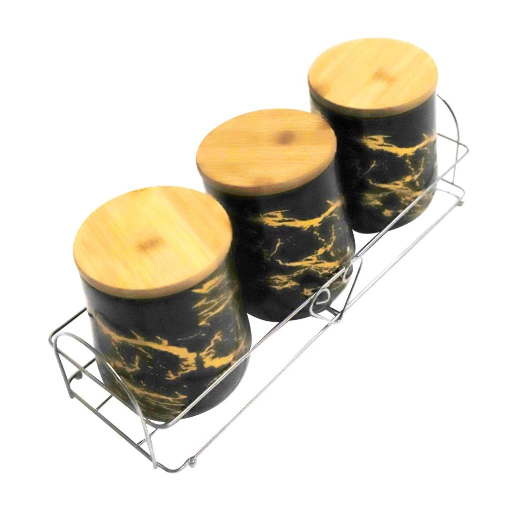 Abstract Print Ceramic Canister Set of 3 Pcs with Wooden Lid and Stand 650 ml/180 ml