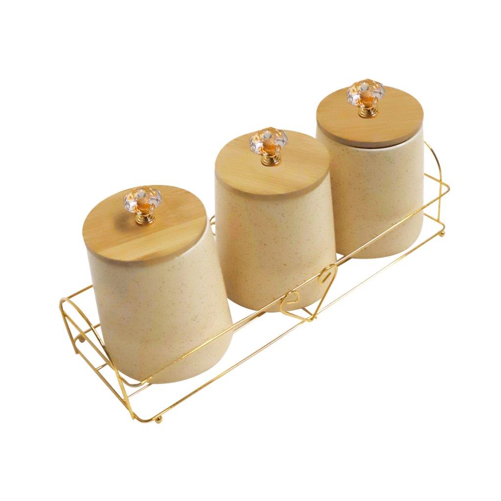 Abstract Print Ceramic Canister Set of 3 Pcs with Wooden Lid and Stand 650 ml