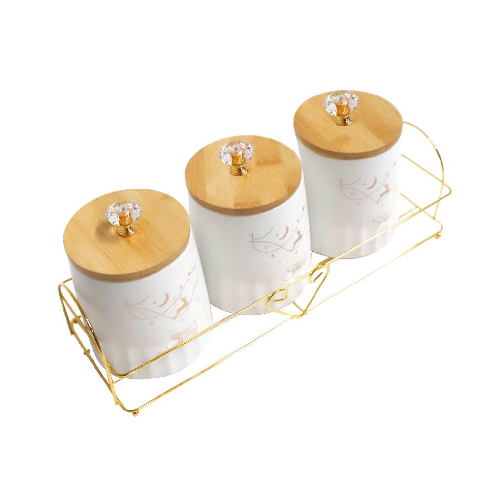 Abstract Print Ceramic Canister Set of 3 Pcs with Wooden Lid and Stand 650 ml
