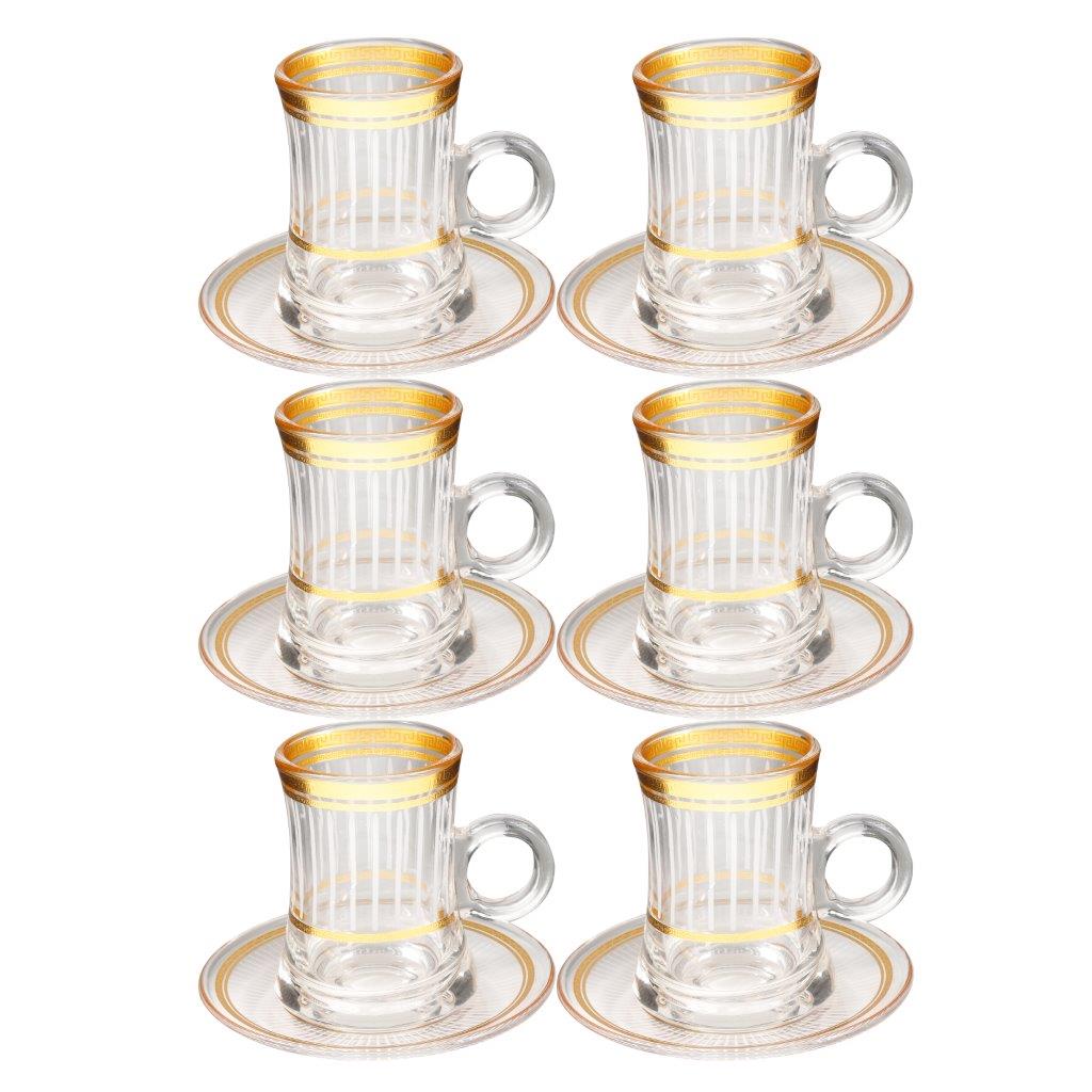 Deco Engraved Gold Abstract Design Istikana Glass Tea Cup and Saucer Set of 6 Pcs 11 cm/120 ml