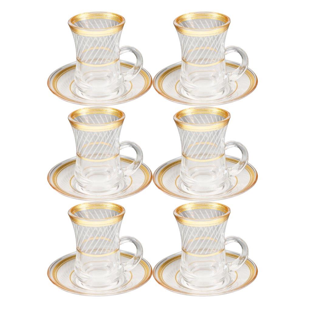 Deco Engraved Gold Abstract Design Istikana Glass Tea Cup and Saucer Set of 6 Pcs 11 cm/70 ml