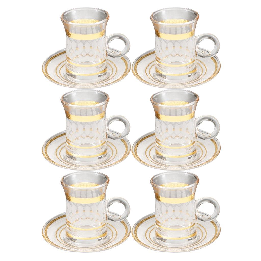 Deco Engraved Gold Abstract Design Istikana Glass Tea Cup and Saucer Set of 6 Pcs 11 cm/70 ml