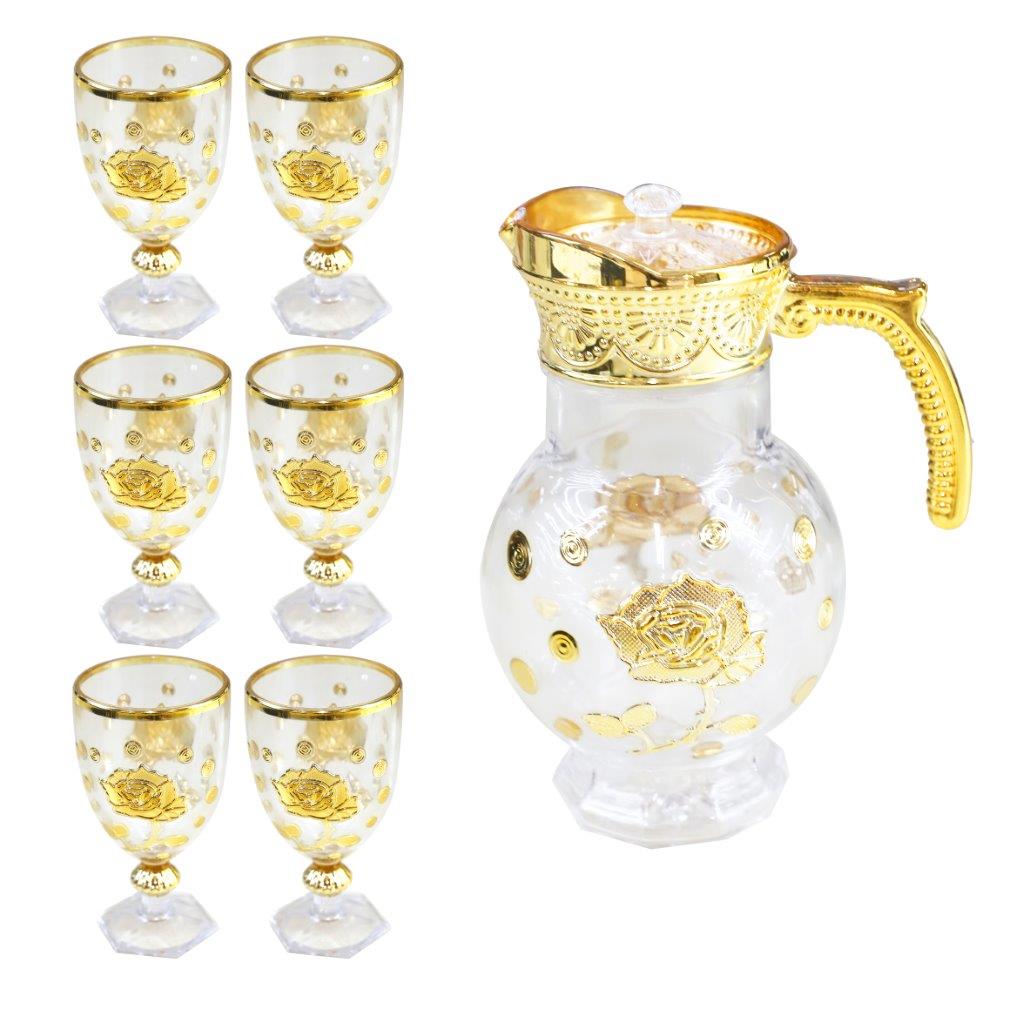 Gold Deco Water and Beverage Jug Decanter and Footed Tumblers Set of 7 Pcs