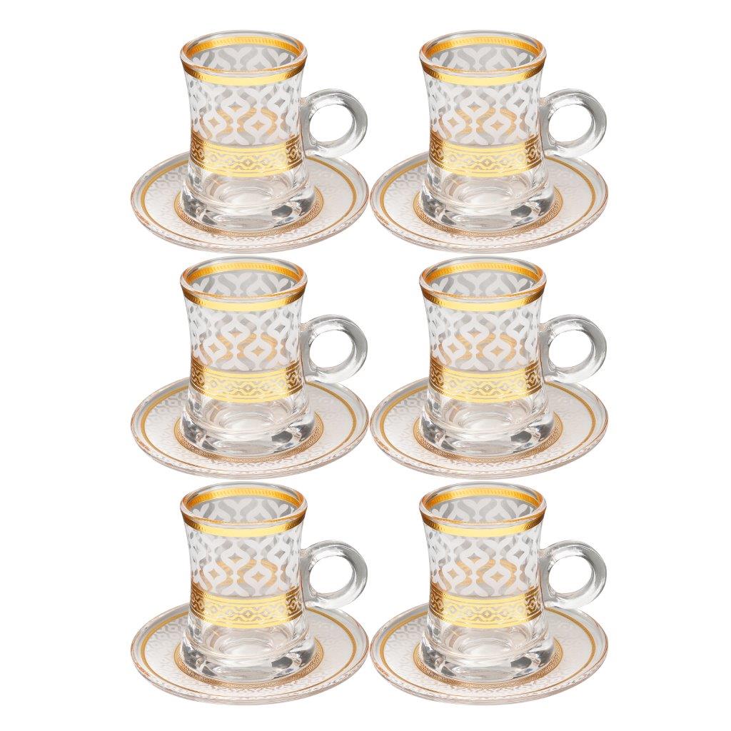 Deco Engraved Gold Abstract Design Istikana Glass Tea Cup and Saucer Set of 6 Pcs 11 cm/120 ml
