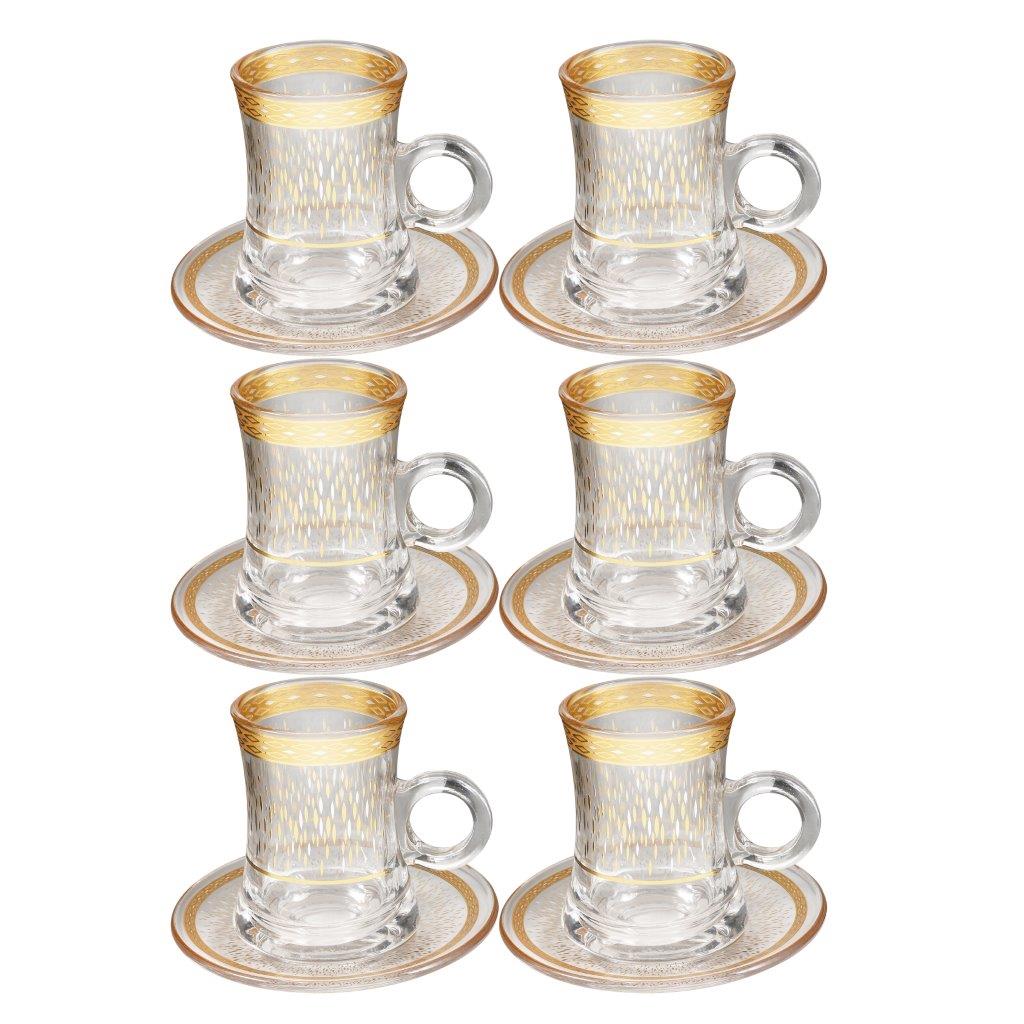 Deco Engraved Gold Abstract Design Istikana Glass Tea Cup and Saucer Set of 6 Pcs 11 cm/120 ml