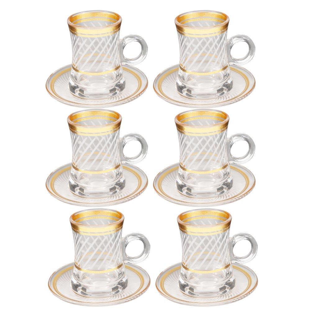 Deco Engraved Gold Abstract Design Istikana Glass Tea Cup and Saucer Set of 6 Pcs 11 cm/120 ml